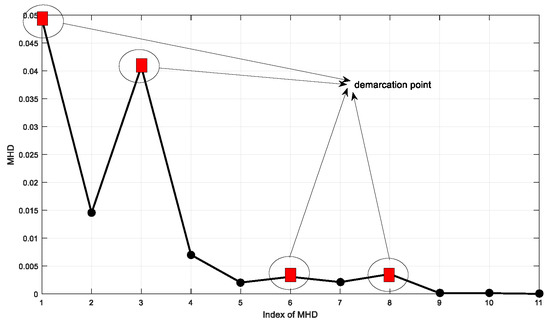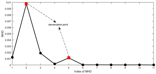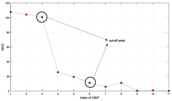 In this section, a method is proposed to obtain the minimum number of IMFs and physical meanings based on frequency characteristics of IMFs. Firstly, it combines the adjacent IMFs into new modes (sign as CIMFs). Then, a FFT analysis is performed for each CIMF (obtained waveform is sign as FC). In this way, the FFT can organize the IMF containing the same or similar frequency bands into a class. In addition, because a PDF can reflect a state of knowledge of the desired signal rather than only a frequency based on Bayesian theory, a PDF contains complete information about the FC, and is expected to capture the feature information of FCs (sign as PFC). Finally, the similarity is quantized by the MHD of the adjacent PFC to adaptively obtain the final IMFs (FIMFs).