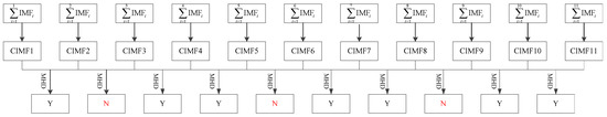 - Decompose the -th residue and extract the first mode, and the -th mode can be obtained using the following equation ():Here, indicates the symbol function of the k-th IMF.