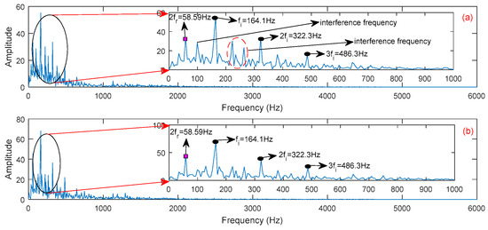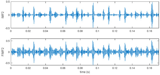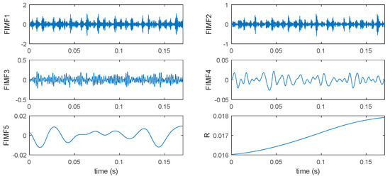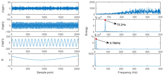 Figure 8 is the final combined FIMF and corresponding Fast Fourier transform (FFT). It was found that the identified frequency component of FIMF2 and FIMF3 are almost in accordance with theoretic frequencies in Equation (15) (75 Hz and 10 Hz). The FIMF1 and R are the noisy IMF and residue, respectively; this proves that the proposed method can be used to distinguish the frequency components of a complicated signal and avoid the interference of spurious mode.