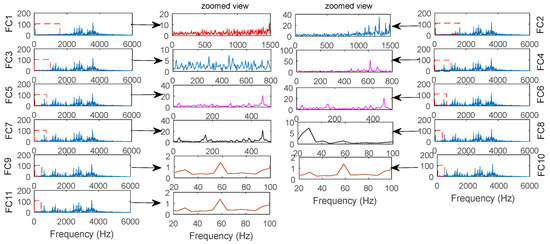 Next, FFT is used to extract the frequency component of the CIMF. Here, the waveform, which is obtained by FFT of CIMF, is referred to as FC. To distinguish the feature difference among FCs, the main frequency band (the dotted box in Figure 4), which contains from 0 Hz to 100 Hz in all FCs, is enlarged (except the frequency band from 100 Hz to 500 Hz for FC1 and FC2). Figure 5 illustrates the frequency spectrum and amplitude information of the original and enlarged FC. It was found that the frequency spectrum of FC1 is same as that of FC2, and that the maximum amplitude of FC1 is less than that of FC2. Among FC3, FC4 and FC5, the frequency spectra were similar. However, the maximum amplitude of FC3 is less than that of FC4 and FC5; the residue FCs (FC6, FC7, FC8, FC9, FC10 and FC11) are identical; this means that the IMF1 and IMF2 can been divided into a class, as can IMF6, IMF 7, IMF 8, IMF 9, IMF 10 and IMF 11. However, it is impossible to determine whether IMF3, IMF4 and IMF5 may also organized into a class. Next, the PDF and MHD were used to enhance their feature difference and quantify classification results.
