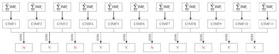 The second and fifth indices of MHD are the local maxima; this means that CIMF2 and CIMF3, CIMF5 and CIMF6 are not similar. CIMF2 combines IMF1 and IMF2, and CIMF3 combines IMF1, IMF2 and IMF3; this illustrates that IMF3 is not similar to IMF1 and IMF2. Likewise, IMFs after IMF6 are not similar to IMF3, IMF4 and IMF5; this means that the IMF3, IMF4 and IMF5 can been organized into a class. Figure 7 shows a relational graph of CIMFs (‘Y’ means that there is a similarity among adjacent CIMFs, while ‘N’ means non-similarity). Thus, the CIMFs are obtained using following equation: