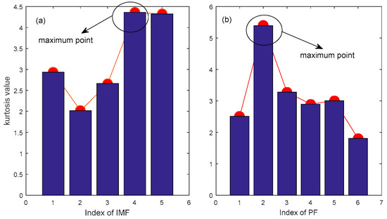 (a) Identifying of IIM with kurtosis method for IMF; (b) Identifying of IIM with kurtosis method for PF.