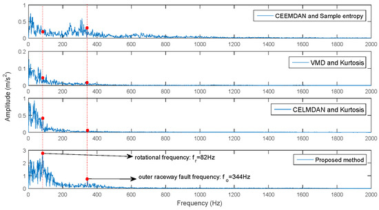 Firstly, the proposed method was used to obtain FIMFs. The two critical parameters in CEEMDAN were 0.2 (the amplitude of added white noise) and 100 (ensemble size). FIMFs are shown in Figure 27. Then, the comprehensive evaluated index was used to identify the IIM (scales range of DFA was from 10 to 100, with step 5 in this paper). Meanwhile, the AE, SE and FE were also used to identify IIM to compare the identified performance with the proposed method. Figure 28 is the identified result. It was found that the second FIMF is IIM for AE, FE and the proposed method. However, the difference in values between the first and second FIMFs for the proposed method is more obvious than in the other methods (the corresponding ratios are 1.01, 1.02 and 1.21 for the three kinds of method); this proves that the proposed method has a strong ability to identify faults, relative to the AE and FE methods. The envelope spectrum was conducted for the second FIMF to extract fault information. Meanwhile, to compare the extracted ability of the rolling bearing, the first FIMF identified by the SE method, VMD [53] and CELMDAN combining with kurtosis [24] were employed to extract fault information. Figure 29a,b shows the kurtosis for the VMD and CELMDAN methods. It was found that the largest value was the index of the forth IMF and the second PF. Figure 30 is the corresponding envelope spectrum. It shows that the feature frequency (rotational frequency () and the outer raceway fault frequency ()) were more obvious than those obtained using the other methods. Here, the theoretical and are 83.33 Hz and 344.76 Hz, as obtained by Equation (22) (the rotational speed is 9000R/min), respectively. The corresponding amplitude is bigger than the others methods. However, for the AE, VMD and CELMDAN methods, it was very difficult to extract rotational speeds and fault frequencies; this is because the extra information interferes with the normal vibration signal, and the rotational frequency and outer raceway fault frequency were all submerged. Thus, it also indicates that the proposed method is more effective at extracting faults in the outer raceways of rolling bearings.