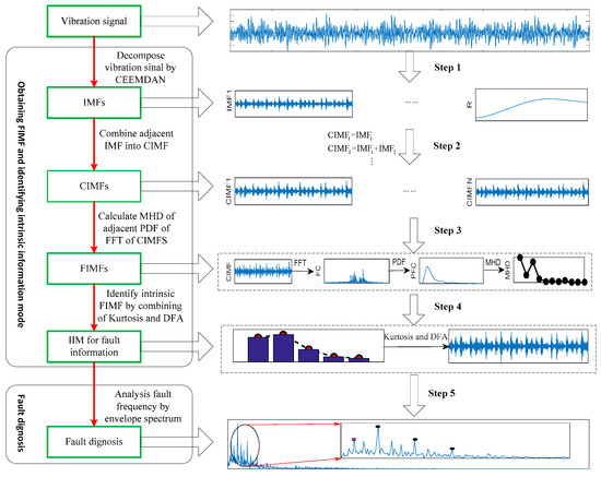 To overcome the above problem, firstly, this paper proposes a method automatically combining IMFs into a minimum number of IMFs with physical meanings to enhance CEEMDAN decomposition. Here, this method produces new mode function (CIMFs) by combining adjacent IMFs; then, the FFT is done for each CIMF to enhance the difference features of the frequency component in IMFs; all information can then be reflected by PDF estimation. The difference of CIMFs is qualified by MHD [43] to obtain new IMFs with a minimum number and physical meanings. Finally, the comprehensive evaluated index based on Kurtosis and de-trended fluctuation analysis (DFA) [44,45,46] was proposed for the extraction of vibration IIMs. The experiment results show that the proposed method outperforms the other methods for rolling bearing fault diagnoses.