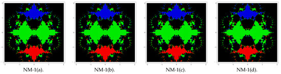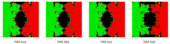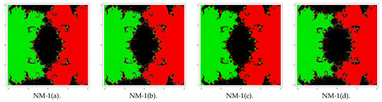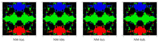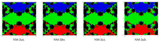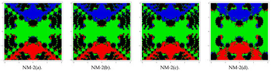 Here, our aim is to analyze the complex dynamics of the proposed methods based on the visual display of the basins of attraction of the zeros of a polynomial in the complex plane. Analysis of the complex dynamical behavior gives important information about the convergence and stability of an iterative scheme. Initially, Vrscay and Gilbert [23] introduced the idea of analyzing complex dynamics. Later on, many researchers used this concept in their work, for example (see [24,25,26] and the references therein). We choose some of the special cases (corresponding to the above forms of and ) of family (4) to analyze the basins. Let us choose the combinations of special Cases II(c) (for ) and II(d) with I(a), I(b), I(c), and I(d) in (4) and denote the corresponding new methods by NM-i(j), i = 1, 2 and j = a, b, c, d.