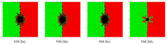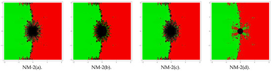 In the first example, we consider the polynomial , which has zeros with multiplicity two. In this case, we use a grid of points in a rectangle of size and assign the color green to each initial point in the basin of attraction of zero ‘’ and the color red to each point in the basin of attraction of zero ‘’. Basins obtained for the methods NM-1(a–d) and NM-2(a–d) are shown in Figure 1, Figure 2, Figure 3 and Figure 4 corresponding to . Observing the behavior of the methods, we see that the method NM-2(d) possesses a lesser number of divergent points and therefore has better stability than the remaining methods. Notice that there is a small difference in the basins for the rest of the methods with the same value of β. Notice also that the basins are becoming wider as parameter β assumes smaller values.