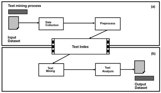 Text mining process. (a) Input data text mining process composed by data collection and preprocess; (b) Output data text mining process composed by text mining and text analysis. Source: The authors.