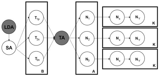Figure 5 shows the stages of the proposed methodology. LDA and SA represent the step explained in Figure 5B in which we obtain T1p that corresponds to a topic with positive sentiment (p), T2x that corresponds to a topic with neutral feeling (x), and T3n that corresponds to negative sentiment (n). Once the text samples that subdivide the topics by feelings are identified and correctly classified, the TA process is applied. As explained above, this process consists of classifying these samples into categories known as nodes represented in Figure 5A. Therefore, N1 corresponds to T1p, N2 corresponds to T2x, and, finally, T3n corresponds to N3.