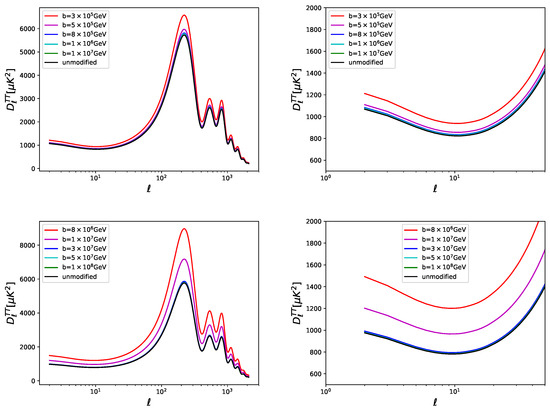 We show the manner in which the SUSY-breaking scale b affects the CMB temperature, polarization, and matter power spectra, respectively in Figure 1, Figure 2 and Figure 3: the effect on the power spectra, when increasing the value of b, is an overall decreasing of all the peaks.