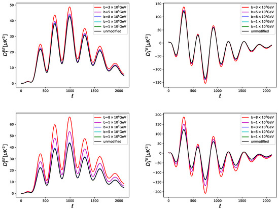 The polarization CMB angular power spectra by varying the SUSY-breaking scale b associated with the landscape effects, for the modified Hilltop model with (upper panels) and (bottom panels).