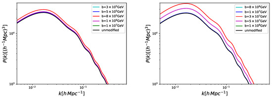 The matter power spectrum by varying the SUSY-breaking scale b associated with the landscape effects, for the modified Hilltop model with (left panel) and (right panel).