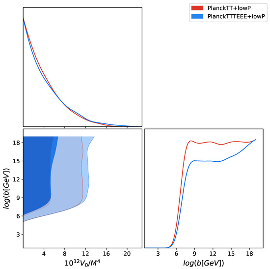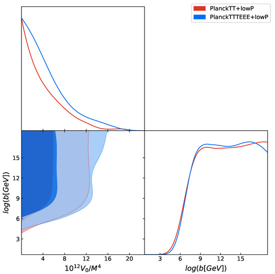 Regarding the inflationary parameters that describe the theory analyzed here, we have now a prediction for the tensor-to-scalar ratio r, which in our analysis is a derived parameter, different from zero at many standard deviations. We find for this model and Planck TT + lowP that , and probably is this value not supported by the data to worsen the value. If we look at Figure 10, which shows the constraints at and confidence levels on the vs. plane, we can see that there exists a lower limit for b at stronger than the case and , shifted towards higher values with respect to the case, for Planck TT+lowP. Finally, we pass from the detection of a value of in Table 2 to just a lower limit in Table 5, and from to for PlanckTT+lowP.