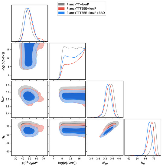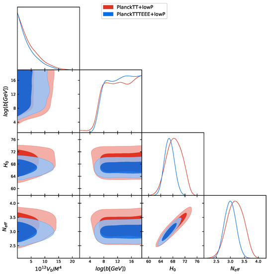Moreover, by introducing a dark radiation component free to vary in this modified Hilltop scenario with , we have very robust constraints for all the cosmological parameters, see Table 3, which have no significant shifts with respect to the standard CDM+ model (see the columns 3 and 4 of Table A1), and with respect to the original Hilltop model with (see Table A2). However, also in this case, for our modified Hilltop inflation the gets worse. The reason we are introducing this extra parameter is that in the minimal standard cosmological model or in other inflationary models (for example [29,30]), to let free to vary produces a value for this neutrino effective number higher than its expected value [31,32], and the shift of the parameters correlated [30,33,34,35,36]. In particular, it is interesting to note the shift towards higher values of the Hubble constant (see Figure 5) that could help in solving the tension now at between the constraints coming from the Planck satellite [3,25,37] and the local measurements of the Hubble constant of Riess et al. [38,39,40]. In the modified Hilltop scenario, we find the same effect when just the PlanckTT+lowP is considered, and the tension on the Hubble constant becomes of . When introducing the polarization data, the tension with Planck is restored at .