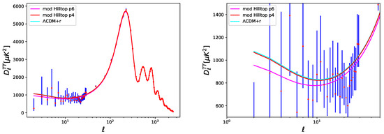 If we look at the Figure 6 and Figure 7, we can see the temperature and polarization power spectra obtained with the best fit of our modified Hilltop model with and the best fit of a minimal standard cosmological model CDM+r, compared with Planck 2015 TT+lowP data: they are about indistinguishable, fitting the data in the same manner.