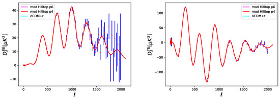 Comparison of the polarization CMB angular power spectra computed for the best fit of our modified Hilltop model with (magenta), the best fit of our modified Hilltop model with (red), and the best fit obtained with a minimal standard cosmological model CDM+r (cyan), with Planck 2015 TT+lowP data (points with error bars).