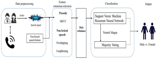 Figure 1 shows an overview of our framework. The input is the combination of 2-channel speech consisting of two speakers. The data were pre-processed to highlight non-lexical speech features which were then verified by statistical analysis. The effective features generated by feature extraction and selection were MFCC, overlapping, and lengthening. Machine learning techniques were utilized to determine the speakers’ genders and SVM/RNN were utilized to produce experimental results. The classification system was also computed using majority voting to separate the classified voices from ambiguous voices by a neutral margin. The final output was the percentage likelihood that the voice belonged to a male or female speaker.