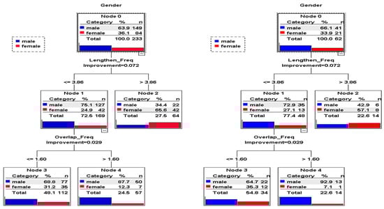 We performed 10-fold cross validation using CRT analysis for gender classification based on overlapping and lengthening in emergency calls. Figure 3 shows one example of the structure models developed using CRT analysis. As shown in Figure 3, the cut-off point is vital for gender classification. The node was divided by lengthening; females were above 3.86 and males were below. The node was split again by a cut-off point for overlapping, specifically a frequency per minute of 1.60.