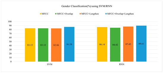 We also conducted gender classification using the machine-learning techniques, SVM and RNN, with some features (MFCC, overlapping, and lengthening). As expected based on previous analyses, the combination of the proposed non-lexical features and the more traditional MFCC produced more accurate gender classification results than the use of MFCC alone (Figure 4). This result indicated that the proposed features can be used to overcome the shortcomings of existing gender classification methods.