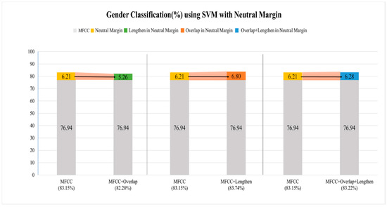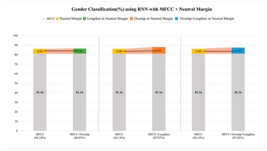 Furthermore, we experimented using a neutral margin, defined as above, for investigating what kind of feature set is the most effective as well as how to use it for the improvement of gender classification. First, we empirically found the neutral margin based on the prior result, which was done with only MFCC. Then, we reclassified data within the neutral margin. With regard to the neutral margin, we achieved a higher accuracy with lengthening than with other non-lexical speech features, including MFCC only. For SVM, it gained about 0.6% better accuracy over MFCC only (Figure 5). For RNN, the accuracy of non-lexical features was significantly improved, especially lengthening (Figure 6) compared to the other non-lexical speech features, as well as MFCC only.