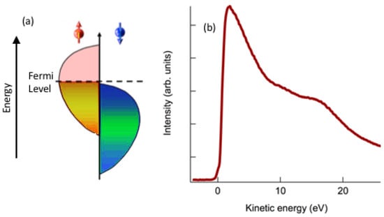 Any form of ionizing radiation (photons, electrons or ions) interacting with a solid will produce electrons. Primary electrons are emitted without any energy loss, but most electrons lose energy as a result of numerous collisions. The resulting secondary electrons (SEs) have very low energy, in the 0–10 eV range, as seen in a typical energy distribution curve shown in Figure 1b. In general, the electrons are unpolarized, but a high degree of polarization can be achieved if the material is ferromagnetic. The manner by which this is achieved is shown in Figure 1a. A ferromagnet has an imbalance between the number of majority and minority spin valence level electrons. The majority band in Figure 1a is totally filled while the minority band is partially filled. As the electrons scatter in the material, there is a higher density of minority band states available for occupation, so more electrons will scatter into them than into majority states. Hence the majority electrons have a longer mean free path than the minority ones, resulting in a net spin polarization of the former. Although subtleties exist in this model, it can be used to understand the basic process leading to SE polarization [27,28,29,30,31].
