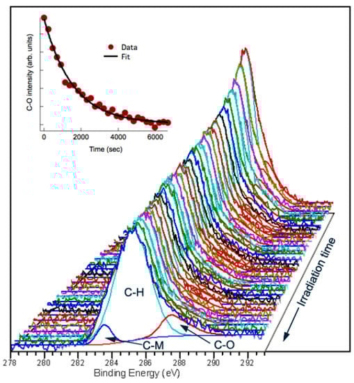 C 1s X-ray photoelectron spectroscopy (XPS) spectra of ~2 monolayers of (S)-2-butanol adsorbed on an argon ion sputter cleaned permalloy surface obtained sequentially during 1190-eV X-ray irradiation. The area of the C–O peak component as a function of irradiation time is shown in the inset. Data points are shown by the red dots and the solid line represents an exponential fit to the data.