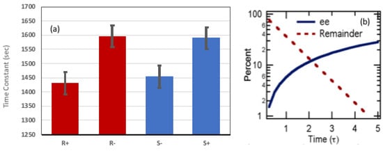 (a) Summary of the time constant results. The average time constants, with error bars, for (R)-2-butanol are shown in red, while those for (S)-2-butanol are in blue and the magnetization direction is denoted by +/–. (b) Calculation of the percentage enantiomeric excess (ee) (solid, blue line) and the percentage remaining concentration (dashed, red line) as a function of time, in terms of the dimensionless quantity (time constant (τ)/time (t)), based on a time constant difference of 10%. The right scale is a mirror of the left scale.