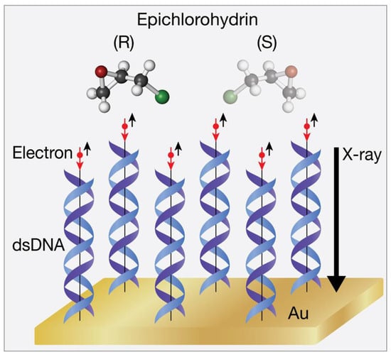 Figure 4 depicts as a schematic diagram of an experiment designed to test this idea. The additional chiral molecule was (R)- or (S)-epichlorohydrin (C3H5ClO, Epi), which was adsorbed on a self-assembled monolayer of 70 base-pair long double-stranded DNA (dsDNA) cooled to 90 K. The dsDNA layer acts as a spin filter for the initially unpolarized secondary electrons produced by X-ray irradiation of the gold substrate. These secondary electrons then react with adsorbed Epi and the reaction kinetics were determined by the following changes in the Cl 2p XPS spectra in a similar fashion to Section 3.1 and quantum yields (QYs) were determined. When the two enantiomers were adsorbed on bare Au, the QYs were the same, but when adsorbed on the dsDNA layer the QY for S-Epi was ~16% greater than for R-Epi [45].