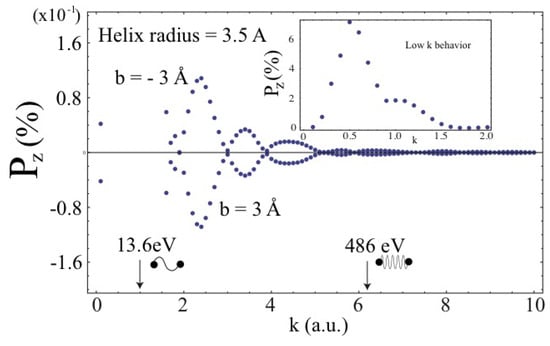 The above work shows that dsDNA can act as an effective spin filter for secondary electrons in the energy range 0–10 eV (Figure 1b). However, additional studies indicate that dsDNA does not effectively filter higher energy (>30 eV) electrons [44]. The cause for this can be understood by examining the theoretically predicted polarization for a chiral overlayer as a function of wave vector, k (E = 13.6 eV*k2) shown in Figure 5. One can readily see that the relevant energy regime for chirality effects is k = 0 − 1.5 (0–30 eV) as shown in the inset and the effect decays very strongly at higher values [44].