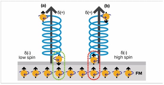 The explanation for the chiral selective adsorption on a magnetic substrate can be understood by referring to Figure 6. When a chiral molecule binds to a surface, charge transfer occurs resulting in electric dipole polarization and excess of electrons and holes on opposite ends of the molecule. This charge polarization is accompanied by spin polarization via a CISS type mechanism [39,50], with the spin orientation determined by the chirality of the molecule. The substrate–molecule interaction will be stabilized via an exchange interaction if the spin of the electron on the end of the molecule bound to the surface and that of the ferromagnet (FM) are antiparallel (low spin state, Figure 6a) and destabilized if they are parallel (high-spin state, Figure 6b). For further details see Refs. [40,46].