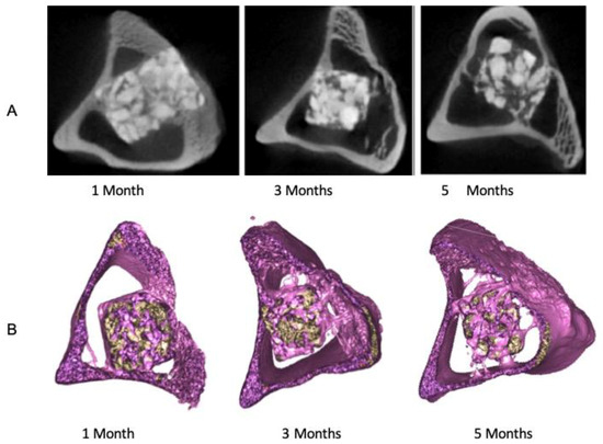 (A) Transverse mCT images of implanted area, obtained at different times of study (1, 3 and 5 months); (B) 3D mCT image reconstruction of samples obtained at 1, 3 and 5 months of study. Figure show the non-doped scaffold as a representative of both materials.