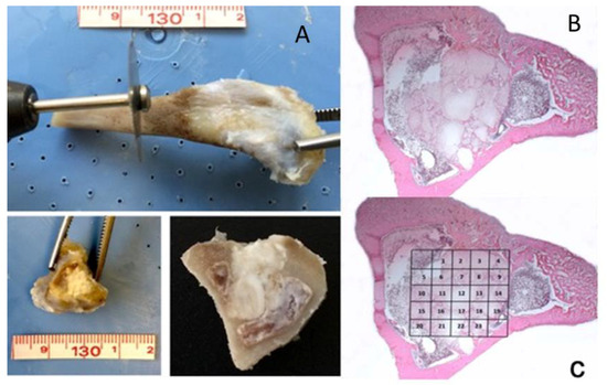 Histological-Histomorphometric procedure. (A) Samples including implanted area were obtained perpendicularly to the long axis of tibia, using an electric circular saw; (B) Panoramic histological view (×5.4) containing porous material; (C) ×50 magnified and consecutives images on a panoramic histological view.