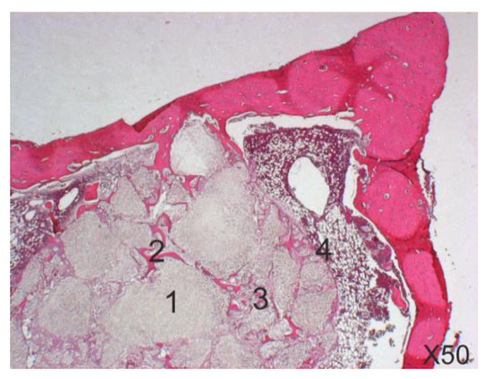 50× magnified image obtained from the panoramic histological view of the non-doped scaffold as a representative of both materials. Four different components can be identified in the study: (1) non-absorbed implanted material; (2) neoformed bone tissue; (3) connective tissue; (4) special material.