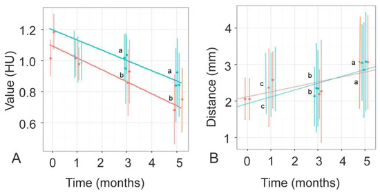 Evolution of implanted material after 1, 3, and 5 months post-implantation in each animal group (n = 5). Pre-implanted material results are considered as time 0. Doped (Activagen®-treated) and no-doped material have been represented as blue and red dots, respectively. (A) For evaluation of implant resorption, results have been presented as the average HU ± S.D. in each preselected cylindrical ROI (4 × 4 mm3). Different letters a, b denote significant differences between type of material for each time of study. (B) Per each cubical ROI (10 × 10 × 10 mm3), implanted material dispersion in the peripheral tissue has been presented as the center of mass per each implant (dot) and the global variation of distance (mm) of the preselected voxels (>1.10 HU) from this center of mass (bars). A > 1.10 HU window was set to identify voxels corresponding to biomaterial. Different letters a, b, c denote significant differences between time).