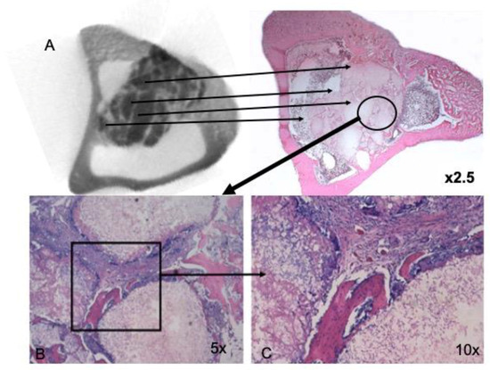 (A) Visual correlation between histological (hematoxylin and eosin stain) and axial mCT images. (B,C) Detailed view (×5 and ×10 magnification) of area contained between scaffolds fragments. Corresponding to the non-doped scaffold as a representative of both materials.