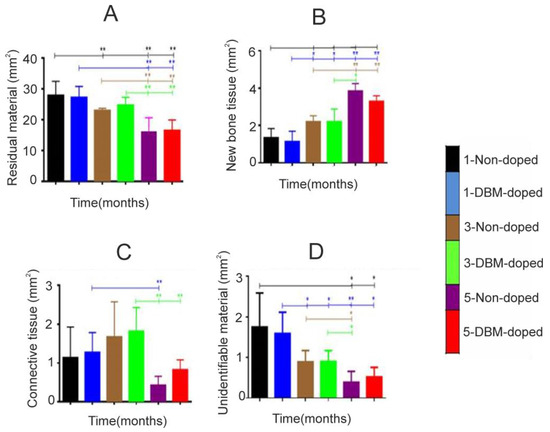 In parallel to bone tissue increment, a significant progressive reduction in surface of implanted material (Figure 8A) and basophilic component surrounding neoformed bone tissue (unidentifiable material) (Figure 8D) can be described. Regarding implanted material, its surface decreased from 27.21 ± 5.28 mm2 (non-doped) and 26.92 ± 4.19 mm2 (DBM-doped), to 15.88 ± 5.01 mm2 (non-doped) and 16.52 ± 3.28 mm2 (DBM-doped) 5 months post-surgery. Similar behavior was described for unidentifiable material surface, decreasing from 1.75 ± 0.90 mm2 (non-doped) and 1.64 ± 0.46 mm2 DBM-doped) at 1 month, to a final value of 0.30 ± 0.29 mm2 (non-doped) and 0.36 ± 0.23 mm2 (DBM-doped) 5 months post-surgery.