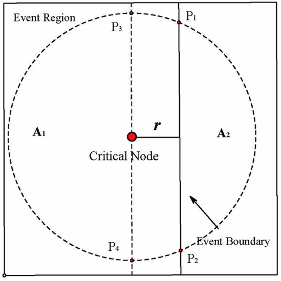 Suppose that the sensor data of nodes in the event area forms a gaussian distribution and the readings of other sensors in form another distribution , where is small compared with . A sensor node is considered to be an affected node when its sensing information exceeds the threshold , while the others are called normal nodes. Let us suppose that the event boundary is a circular boundary centred on the event source. The sensor area is shown in Figure 1, the black nodes are the boundary nodes. Figure 1 on the right shows the local area of a single boundary node.