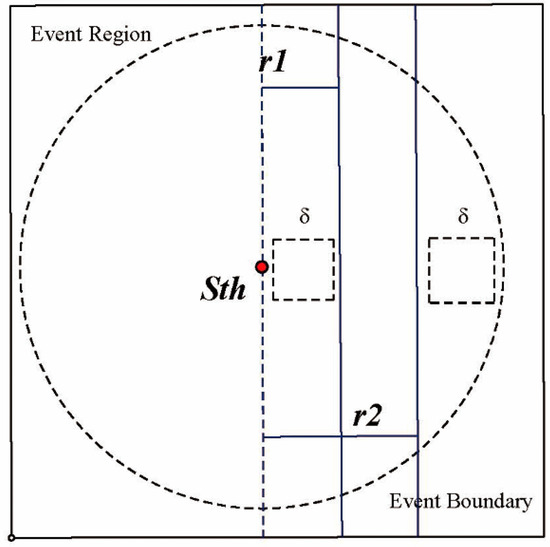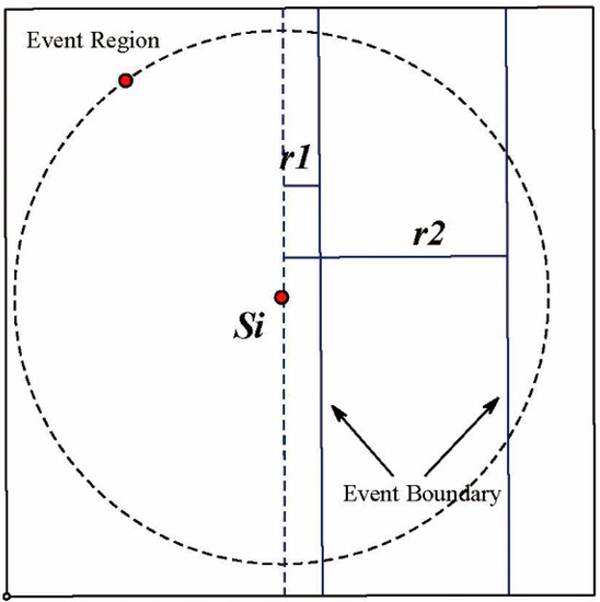 - The term sensor area, denoted as , not only refers to the geographical area covered by the WSN but also to the set of nodes in this area. We denote an event region as , which is the sub-region of covered by an event and is the remaining region. Thus, . Hence, a sensor node means it is an affected node while means it is a normal node.