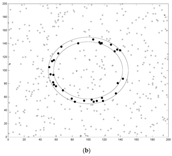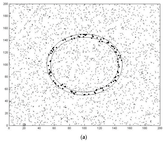 In this simulation, wireless sensors are uniformly distributed in a 200 × 200 square area. Suppose that the square area is in the first quadrant of the plane coordinates. We suppose that the test event area is a circle with a radius of 50 and the centre of the region is located at (100, 100). Assume that normal node readings satisfy the normal distribution while sensor readings are depicted form in event area. Then the threshold . Mean and variance can be selected according to the actual situation, as long as the standard deviation is small compared with . In this simulation, we set , , .