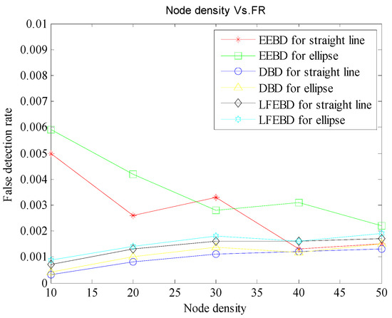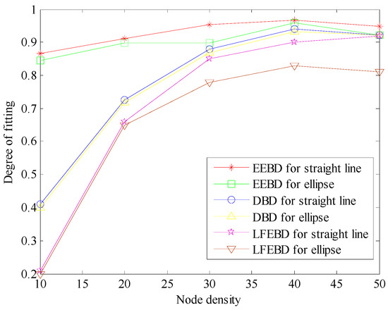 Figure 10 and Figure 11 show comparative studies of the DF and FR, as mentioned above. From Figure 10, one can observe that the proposed algorithm has a better degree of fitting than the DBD and LFEBD algorithms when the node density is under 40. This demonstrates that the node density is proportional to the DR in both boundary shapes. When the density is increased, the number of sensors in will increase accordingly. Thus, more sensors are close to the boundary, that is, more sensors are in the . So the geometric probability based on the area is more accurate. From the Figure 10, with the increase in node density, especially when it is greater than 30, both the degree of fitting increase slightly but our algorithm converges earlier with a density of about 20.