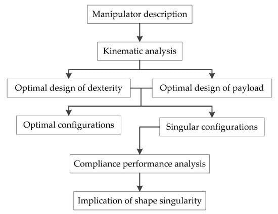 With the selected performance indices, the concrete flow for optimal design and shape singularity analysis is as shown in Figure 1. Firstly, the inverse position and Jacobian are analyzed based on the parametric kinematic model. Then, dexterity and payload performance are evaluated for optimal design. Moreover, shape singularity is identified by screw theory with its compliance performance analyzed. At last, the implication of shape singularity is discussed.
