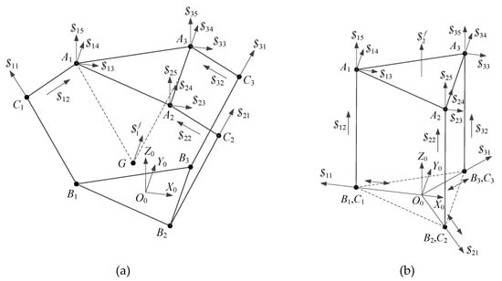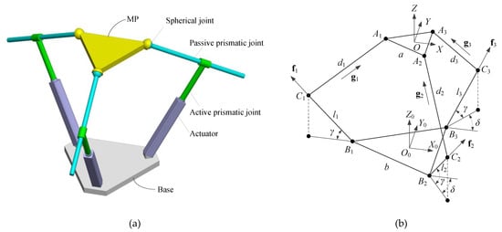 As depicted in Figure 2b, global frame {O0} is fixed on the base, with the origin coinciding with the centroid of the base, where Y0-axis is pointed along the direction of B2B3, Z0–axis is perpendicular to the base. Local frame {O} is attached to the centroid of the MP in a similar way.