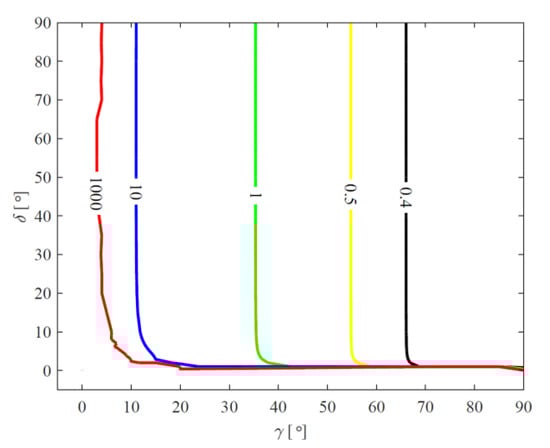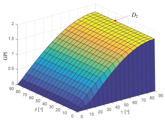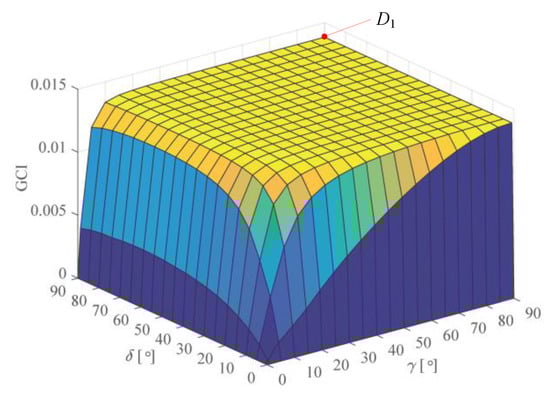 According to Equation (13), the distribution of compliance performance of the proposed 3-PPS PM is obtained and depicted in Figure 10. It is found that the GSI changes significantly for the PM close to shape singularity (δ = 0°, γ = 0°), while the zones near the shape singularity own great compliance. On the other hand, the compliance performances of the zones far away from shape singularity are very poor.