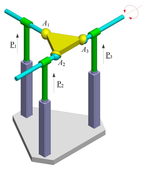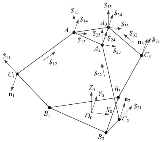 It is well known that screw theory [] is a useful approach for singularity analysis. In this section, screw theory is applied to shape singularity analysis of the proposed 3-PPS PM. As shown in Figure 8, the considered mechanism is described by screws. Taking the first limb as an example, the twist screws can be written as: