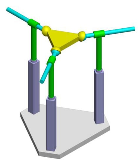 In order to overcome the drawbacks above, PMs with fewer than six degrees of freedom (DOF) are considered []. For examples, Rezaei et al. [] presented a 3-PSP (P, R, U and S represent prismatic, revolute, universal and spherical joints, and an underlined letter indicates an actuator.) robot with symmetric geometry, and the forward position problem has a unique solution. Zhao et al. [] investigated the forward kinematics of the Gough-Stewart manipulator with natural coordinates. Bai et al. [,] proposed a U-shape 3-PPR planar PM with the purpose of maximizing the workspace. Tsai and Joshi [] had undertaken a workspace optimization that considered the quality of the workspace of a spatial 3-UPU PM. Stock and Miller [] focused on the optimal kinematic design of a linear Delta robot, aiming to reach a compromise between manipulability and workspace size. Xu and Li [] converted the original 3-PRC translational PM into a non-overconstrained one in order to solve the movability problem. Liu et al. [] studied a new family of spatial 3-DOF fully PMs, which can exhibit high rotational capability.
