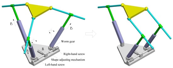 The inherent great compliance of shape singularity can be applied to mechanism design. Here, adjustable compliance is proposed, to be exact, the compliance is adjusted by changing the shape of the mechanism. As shown in Figure 11, the second and third PPS limbs of the considered PM are attached to the base by revolute joints, and the axis of the rotation is perpendicular to the base. R is the actuator of the shape adjusting mechanism, which is used to change the shape of the base. At the positioning stage, R is locked, namely, the base is fixed with the non-singular shape. The mechanism will possess a good stiffness performance, which makes precision positioning possible. At the stage of interaction with the environment, R will drive the two limbs to the singular shape (δ = 0°), then the mechanism could own a great compliance performance under the singular shape.