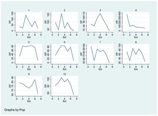 From the above table, we can see that the average efficiency of our proposed estimator, , is the lowest, as for this estimator has the smallest value. We can also see that the correlation coefficient has a significant effect on the efficiency of , and the regression model for this estimator is significant at 5%. The value of for our proposed estimator is the second lowest, which indicates that this estimator is the second best estimator for the estimation of population variance. The regression coefficient is significant at 10% for this estimator, which indicates that the correlation coefficient between the study and auxiliary variables will provide useful information to predict the efficiency of estimator . The other significant regression model is for ; for this estimator, the coefficient of is significant. This indicates that the coefficient of kurtosis of the auxiliary variable has a significant effect on the efficiency of this estimator. We can also see from Table 4 that the estimator showed the worst performance in this study, as coefficient for this estimator has the highest value.