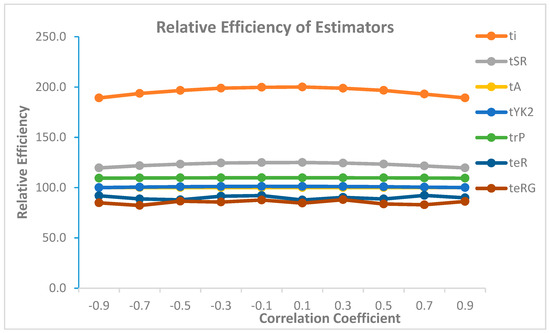 In this section, we give the results of the simulation study to see the performance of our proposed estimator. The simulation study was conducted by generating populations of size 500 having a specific correlation structure between the study and auxiliary variables. For each of the populations with a specific correlation coefficient, various estimators were computed. The process was repeated 20,000 times, and we then computed the mean0square error of each estimator alongside the percent relative efficiency as defined in Equation (26). The results of this simulation study are given in Table 5.