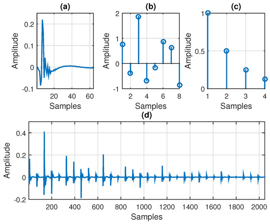 Impulse responses used in simulations: (a) of length (the first impulse response from G168 Recommendation [37]), (b) of length (random impulse response with Gaussian distribution), (c) of length (its elements are evaluated as ), and (d) the global impulse response of length .