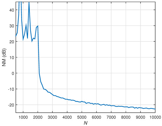 The matrix involved in the linear system, to be solved in the case of the conventional Wiener filter from Equation (19), is of size ; hence, a number of data samples larger than L are needed to estimate the statistics in Equations (75) and (76), in order to obtain a good solution. This is shown in Figure 2, where different values of N (that is, the available amount of data in Equations (75) and (76)) are used and the solution provided by the conventional Wiener filter is evaluated for each of these values. Similar to Equation (74), the performance measure in Figure 2 is the NM (in dB), which is defined as ; in this case, the conventional Wiener solution results from Equation (19) (using Equations (75) and (76)). As we can see, the conventional Wiener filter achieves a reasonable decrease in misalignment only when a large amount of data (i.e., ) are used to estimate the statistics in Equations (75) and (76).