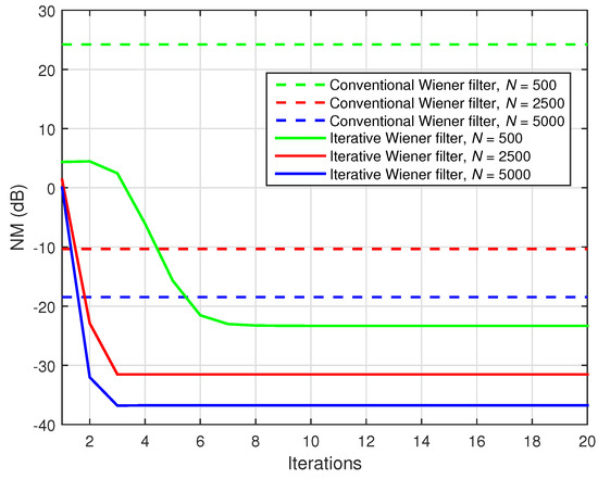The main advantage provided by the iterative Wiener filter is that it operates with much shorter filters (due to the decomposition in Equation (20)) and, consequently, the dimensions of the linear systems of equations to be solved are significantly reduced. Therefore, even with a small amount of data (i.e., ), the iterative Wiener filter is able to obtain a reliable estimation. This advantage is outlined in Figure 3, where the solution provided by the conventional Wiener filter (based on Equation (19) and using Equations (75) and (76)) is compared to the iterative Wiener filter from Equation (42). The performance measure is the NM (in dB), which is evaluated based on Equation (74), for the identification of the global system . Three amounts of data are considered in this experiment, that is, and 5000. Clearly, in the first case (), the conventional Wiener filter leads to an inaccurate solution due to the small amount of data (as compared to ). When the amount of data slightly exceeds the value of L (e.g., ), the conventional Wiener filter provides a more reliable solution, that is, the misalignment attenuation is approximately dB. Finally, for a large amount of data (), this conventional solution is improved in terms of accuracy (e.g., the misalignment is close to dB). On the other hand, in all the previous cases, the proposed iterative Wiener filter achieves a much more accurate solution (with only a few iterations), which outperforms by far the conventional one (even in the case when a small amount of data are available, e.g., ). For example, the iterative Wiener filter which uses yields a lower misalignment level with respect to the conventional Wiener filter with .